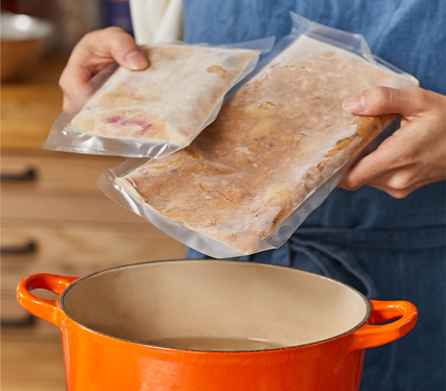 食べたい時に、湯煎で簡単にお召し上がりいただけます。また冷凍食品だからこそストックしやすいように、かさばらないサイズ(薄さ)になっております。1人暮らしなどの小さめな冷凍庫でも収まります。